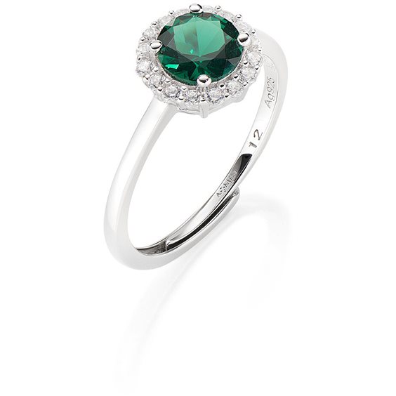 Anello da donna di Amen della collezione Diamonds. Gioiello in argento 925 con placcatura in rodio e zirconi bianchi e zircone verde.