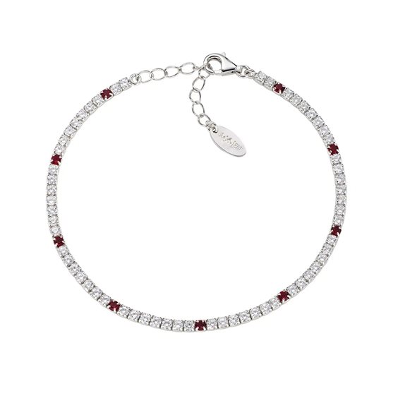 Bracciale Tennis con Zirconi Rossi e Bianchi Bracciale tennis in argento 925 rodiato con zirconi rossi e bianchi da 2 mm. Lunghezza regolabile da 16 a 19 cm con catenina di allungo e chiusura a moschettone