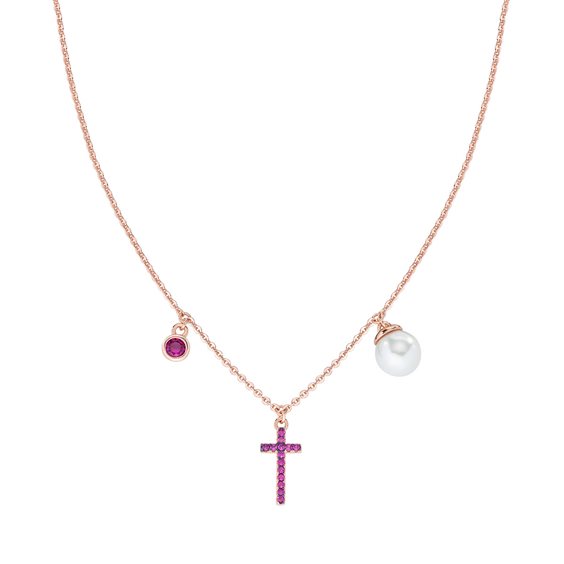 Collana Rosè Croce Zirconata e Perla - Collana Argento 925 perla e zirconi rubino - Rosè - Lunghezza 40 cm +5 cm
