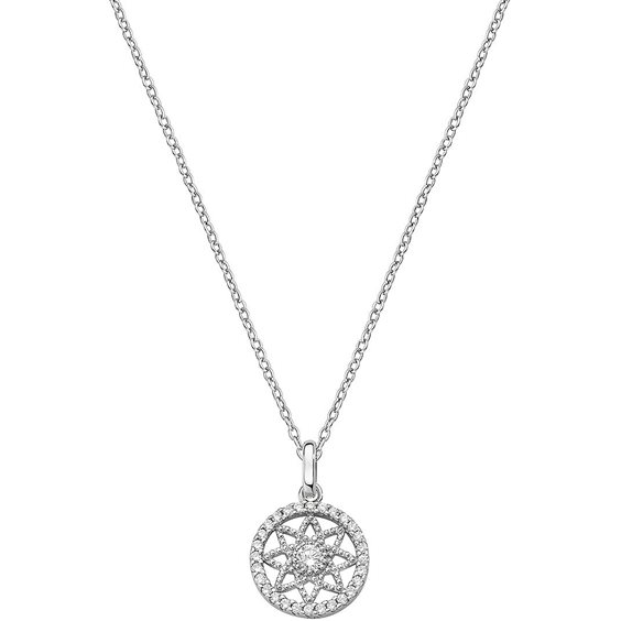 Collana Amen in argento 925‰ con pendente con zirconia. Lunghezza: 40 cm + 4 cm di allunga. Diametro del pendente Ø 1,1 cm.