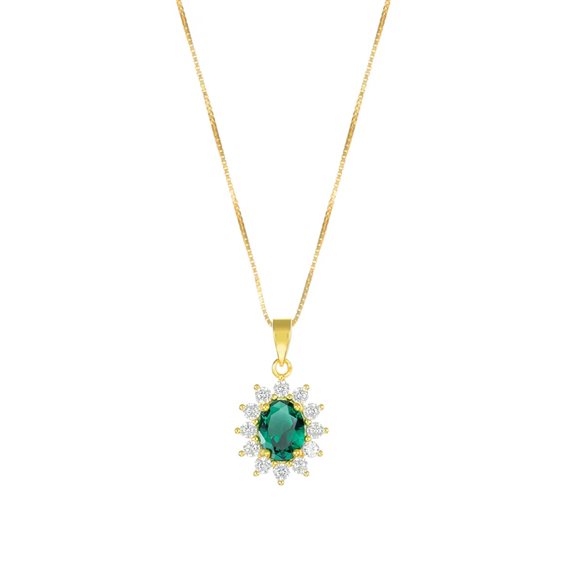 Collana Royal Lady Dorata con Zircone Verde Smeraldo Collana in argento 925 dorato con zircone verde smeraldo taglio ovale e corona di zirconi bianchi. La lunghezza della catena è regolabile da 40 a 45 cm con allungo e chiusura a moschettone, il pendente è 1,4 cm e la pietra centrale 8 mm.