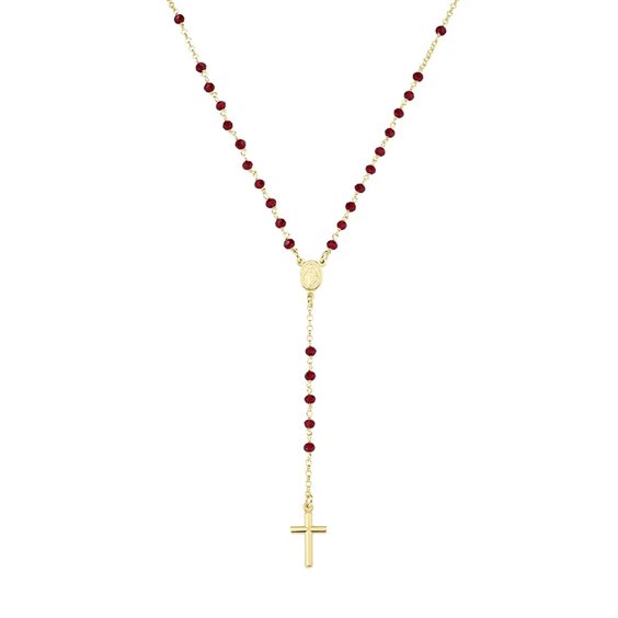 Rosario Classico Dorato con Cristalli Rossi Rosario classico in argento 925 con grani da 3 mm di cristalli rossi sfaccettati, croce e medaglietta rappresentante la Madonna Miracolosa. La collana ha lunghezza regolabile da 48 a 50 cm con chiusura a moschettone e catenina di allungo.