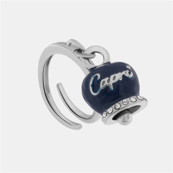 Anello in Metallo con campanella portafortuna pendente impreziosita da smalto blu e cristalli Materiali: Metallo Base, Pietra: Smalto e cristalli, Galvanica: Placcato Rodio, Varianti o Misura: TAGLIA UNICA - REGOLABILE, Colore: BLU. Forma: CAMPANELLA.