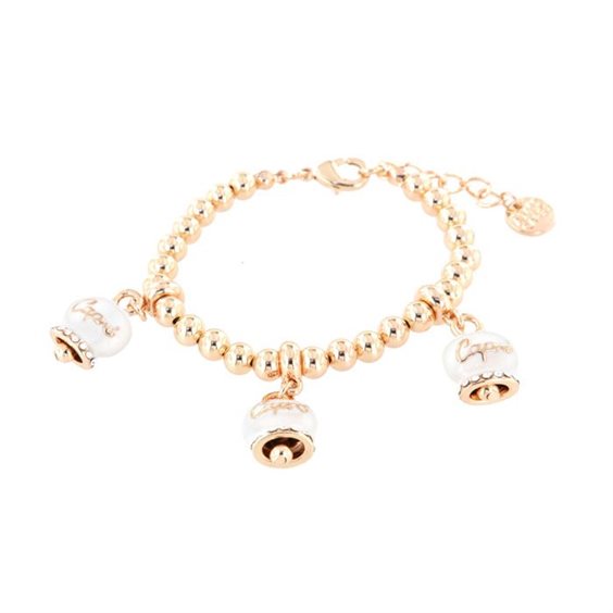 Bracciale in Metallo maglia a sfere, con tre campanelle portafortuna smaltate bianche e cristalli Misura: 17.5+3Cm