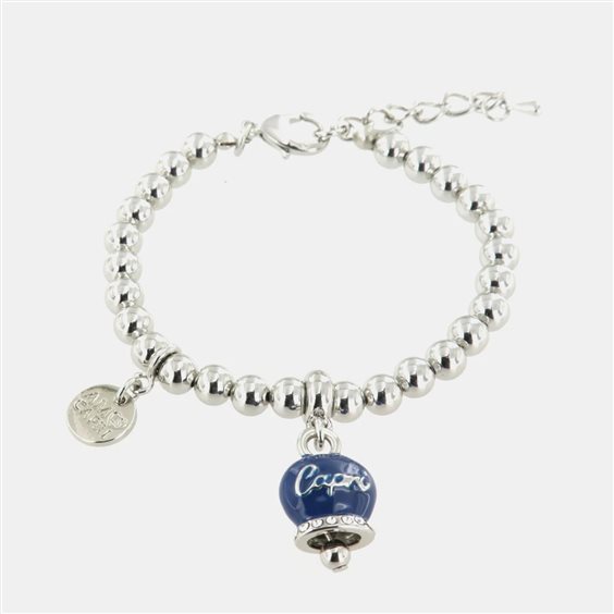 Bracciale in Metallo maglia a sfere, con campanella scritta capri pendente impreziosita da cristalli e smalto blu Materiali: Metallo Base, Pietra: Smalto e cristalli, Galvanica: Placcato Rodio, Varianti o Misura: 17.5+3Cm., Colore: BLU. Forma: CAMPANELLA.