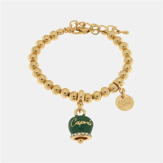 Bracciale in Metallo con campanella scritta capri pendente impreziosita da cristalli e smalto verde Materiali: Metallo Base, Pietra: Smalto e cristalli, Galvanica: Placcato Oro, Varianti o Misura: 17.5+3Cm., Colore: VERDE SCURO. Forma: CAMPANELLA.