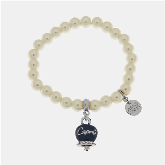 Bracciale in Metallo Bracciale in Metallo con perle e campanella portafortuna in smalto blu con scritta Capri Materiali: Metallo Base, Pietra: PERLE, Galvanica: Placcato Rodio, Varianti o Misura: REGOLABILE ELAST, Colore: BLU. Forma: CAMPANELLA.