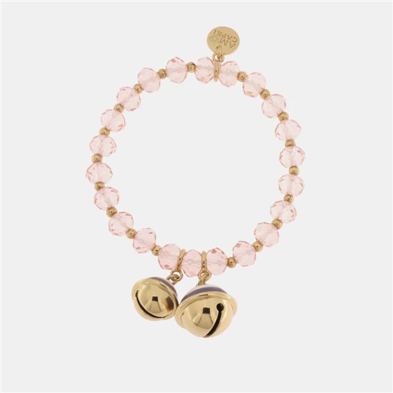 Bracciale in Metallo con sonagli e pietre rosa Materiali: Metallo Base, Pietra: cristalli e smalto, Galvanica: Placcato Oro, Varianti o Misura: REGOLABILE ELAST, Colore: rosa. Forma: sonaglio.