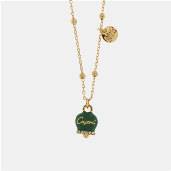 Collana in Metallo campanella portafortuna in smalto verde, con scritta Capri a rilievo e cristalli bianchi Materiali: Metallo Base, Pietra: Smalto e cristalli, Galvanica: Placcato Oro, Varianti o Misura: 50+5CM, Colore: VERDE SCURO. Forma: CAMPANELLA.