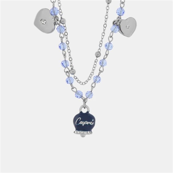 Collana in Metallo con campanella smaltata blu e perline Materiali: Metallo Base, Pietra: Smalto e cristalli, Galvanica: Placcato Oro, Varianti o Misura: CM. 45 + 5, Colore: BLU. Forma: CAMPANELLA.