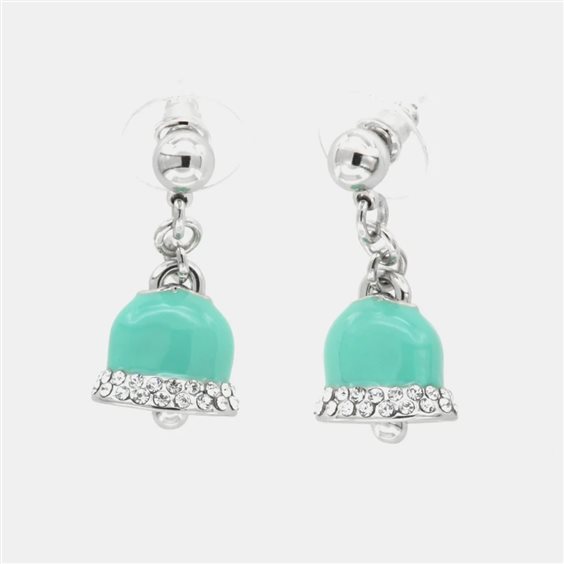 Orecchini in Metallo con campanelle portafortuna impreziosite da smalto verde e linee di cristalli bianchi Materiali: Metallo Base, Pietra: Smalto e cristalli, Galvanica: Placcato Rodio, Colore: VERDE. Forma: CAMPANELLA.