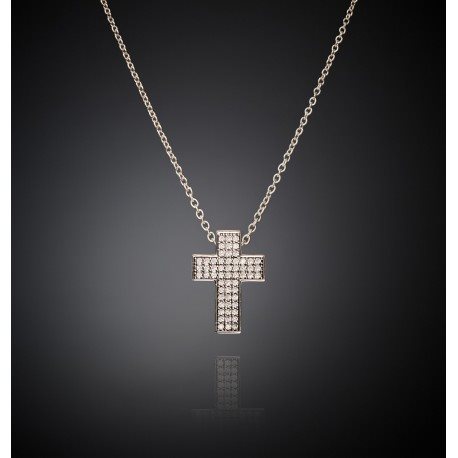 Collana pendente con croce squadrata placcata argento, impreziosita da un pavé di zirconi frontale e laterale. Croce: 18x25,5x5 mm (LxAxP) Catena: 38+7cm REGOLABILE