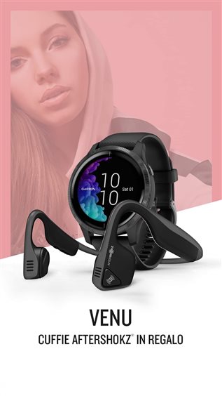 Nasce Venu™: innovazione AMOLED e attività quotidiana al polso Luminoso display AMOLED con colori brillanti e autonomia fino a 5 giorni in modalità smartwatch/fino a 6 ore con GPS e musica Indossalo 24/7 e prenditi cura della tua forma fisica grazie alla più ampia gamma di funzioni di monitoraggio Scarica con facilità la musica sul tuo orologio per ascoltarla senza utilizzare lo smartphone Tieni traccia di tutte le tue attività grazie al GPS e alle app per lo sport indoor integrate Scopri come eseguire i workout attraverso gli esercizi animati, direttamente sul display Forma fisica 100% Venu è stato progettato per prendersi cura di te, aiutandoti a migliorare i tuoi parametri di forma fisica. Eccone alcuni: Venu Monitoraggio dell'energia Body Battery™ Visualizza i livelli di energia del tuo corpo durante la giornata per sapere quando è il momento migliore per allenarti e riposarti. Venu Rilevamento della respirazione Tieni traccia del tuo modo di respirare durante il giorno, il sonno e nelle attività in palestra e a casa come lo yoga Venu Sensore Pulse Ox Il sensore Pulse Ox1 misura la saturazione dell'ossigeno nel sangue mentre dormi, fornendo un valore di qualità e quantità del tuo sonno Monitoraggio avanzato del sonno Ottieni un quadro completo del modo in cui dormi grazie ad un'analisi delle fasi leggera, profonda e REM del sonno1. Venu Rilevamento del ciclo mestruale Scopri di più il tuo corpo grazie al rilevamento del ciclo mestruale. Potrai visualizzare i promemoria sulle mestruazioni e i consigli sulla fase del ciclo, ad esempio quali sono le attività e i cibi preferibili. Venu Analisi dello stress Scopri se la giornata che stai trascorrendo è tranquilla, equilibrata o stressante ed esegui esercizi di rilassamento guidati dall’orologio. Venu Rilevamento dell'idratazione Mantenersi idratati è importante per il proprio benessere. Registra quanta acqua bevi durante il giorno e scopri se hai fatto meglio del giorno prima. Venu Tecnologia cardio da polso L'orologio misura costantemente la tua frequenza cardiaca² e ti avvisa se rimane alta quando sei a riposo. Misura anche l'intensità alla quale stai praticando le diverse attività sportive. Creato per ogni tipo di esperienza Dai cinturini intercambiabili ai resistenti Corning® Gorilla® Glass 3, questo smartwatch è progettato per essere indossato 24/7 e puoi indossarlo anche sotto la doccia perchè è impermeabile fino a 5 ATM. lo schermo AMOLED è brillante in qualsiasi condizione di illuminazione Un mondo di fitness Non dovrai più cercare video tutorial per visualizzare le dimostrazioni degli esercizi. Questo orologio offre allenamenti animati e facili da seguire per la forza funzionale, il cardio, lo yoga e il pilates, da vedere direttamente sullo schermo dell'orologio. Scegli tra i workout precaricati o scarica altri contenuti dalla community online Garmin Connect™. Attività per tutti i levelli Con più di 20 app per lo sport, outdoor e indoor, non avrai più scuse. Scegli tra camminata, corsa, ciclismo, nuoto in piscina, golf e tutti le attività da praticare in palestra come yoga, pilates, cardio, forza funzionale. Inoltre, puoi creare workout personalizzati nell'app Garmin Connect e trasferirli sull’orologio per avere la tua scheda di allenamento direttamente al polso. Inspira ed espira Grazie alla funzione Relax Timer questo avanzato smartwatch offre una varietà di nuove tecniche di respirazione guidate, per rilassarti o per concentrarti in ogni momento della giornata. Venu Smart Notification Ricevi notifiche smart, e-mail o SMS direttamente sull'orologio se associato ad uno smartphone compatibile. La funzione di risposta è attiva solo per gli utenti Android™. Venu Musica Scarica e ascolta la tua musica preferita, incluse le playlist dei tuoi account Spotify®, Deezer o Amazon Music (potrebbe essere necessario un abbonamento). Connettiti con gli auricolari wireless (venduti separatamente) per l'ascolto senza smartphone. Venu Funzioni di sicurezza e rilevamento Mentre l'orologio e lo smartphone sono associati, puoi inviare la tua posizione ai contatti selezionati manualmente oppure, durante le attività all'aperto, automaticamente con la funzione di rilevamento incidente integrato3. Venu Sistema Garmin Pay™ Lascia il portafogli a casa grazie al sistema di pagamento contactless Garmin Pay4 tramite le banche abilitate Venu Connect IQ™ Store Un mondo di personalizzazioni per il tuo orologio scaricando app, widget, quadranti e molto altro. È facile ed è completamente gratuito. Venu Garmin Coach Approfitta di un running coach personale e completamente gratuito al polso, che ti aiuta ad allenarti per la tua prossima 5K, 10K o mezza maratona. 1 Non è un dispositivo medico e non è progettato per l'uso nella diagnosi o nel monitoraggio di qualsiasi condizione medica; visita il sito Web Garmin.com/ataccuracy. Pulse Ox non disponibile in tutti i Paesi 2 Precisione del rilevamento dell'attività 3 Se associato a un telefono compatibile. Per i requisiti e le limitazioni delle funzioni di sicurezza e rilevamento, visita Garmin.com 4 Visualizza il Paese attualmente supportato, la rete di pagamento e le informazioni sulla compatibilità degli istituti bancari sul sito Web Garmin.com/GarminPay/banks SPOTIFY e il logo Spotify sono tra i marchi registrati di Spotify AB. Amazon Music e tutti i relativi loghi sono marchi registrati di Amazon.com, Inc. o delle sue affiliate. Android™ è un marchio di Google Inc. FirstbeatANT