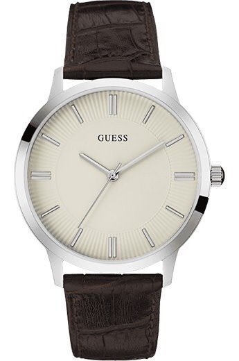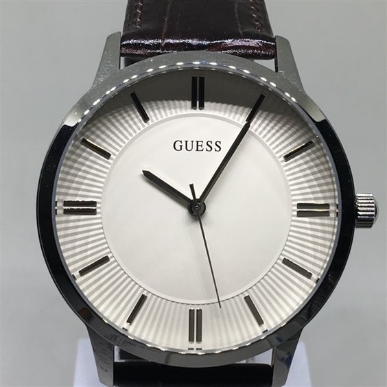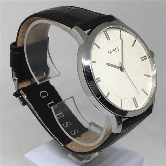 Orologio Di Guess. La Cassa Misura 44 Mm Ed È In Acciaio Lucido. Il Quadrante È Nero E Il Cinturino È In Pelle Nero Con Stampa Coccodrillo.