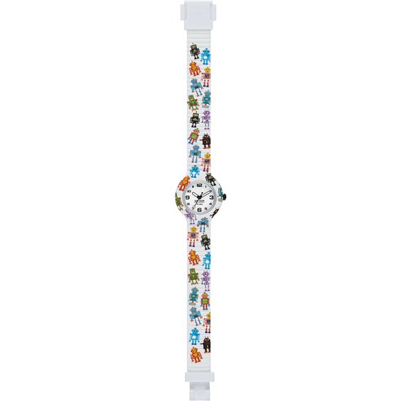 Cinturino stampato con la tecnica water transfer a tema robot, con numeri arabi agli indici per imparare a leggere le ore. Cassa 28 mm, Movimento 3H Miyota 2035, sfere con Luminous, W.R. 5 atm.