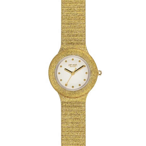 Hip Hop si fa contagiare dalla Sparkling Mania! Il cinturino in silicone di questo orologio da donna si veste di mille glitter light gold, per un indosso super luccicante.