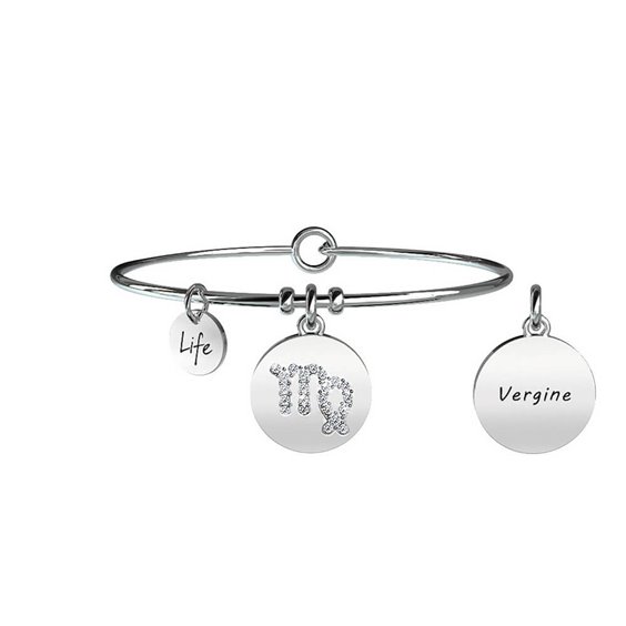 Bracciale bangle in acciaio 316L, circonferenza 20 cm, Ø 6 cm con ciondolo Vergine e cristalli bianchi. Dimensioni: ciondolo Ø 17 mm, cristalli Ø 1.30 mm