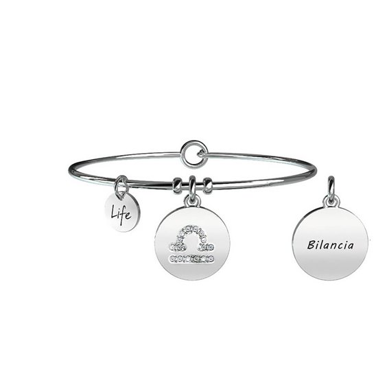 Bracciale bangle in acciaio 316L, circonferenza 20 cm, Ø 6 cm con ciondolo Bilancia e cristalli bianchi. Dimensioni: ciondolo Ø 17 mm, cristalli Ø 1.30 mm