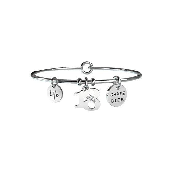 Bracciale bangle in acciaio 316L, circonferenza 20 cm, Ø 6 cm ciondolo 18. Scritta: CARPE DIEM. Dimensioni: ciondolo rotondo Ø 10 mm, ciondolo 18° 11x13 mm, cristalli Ø 2 mm