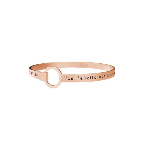 Bracciale rigido Kidult in acciaio 316L rose gold pvd a fascia con frase filosofica.Bracciale in acciaio 316L ipoallergenico.“La felicità non è avere quello che si desidera, ma desiderare quello che si ha'