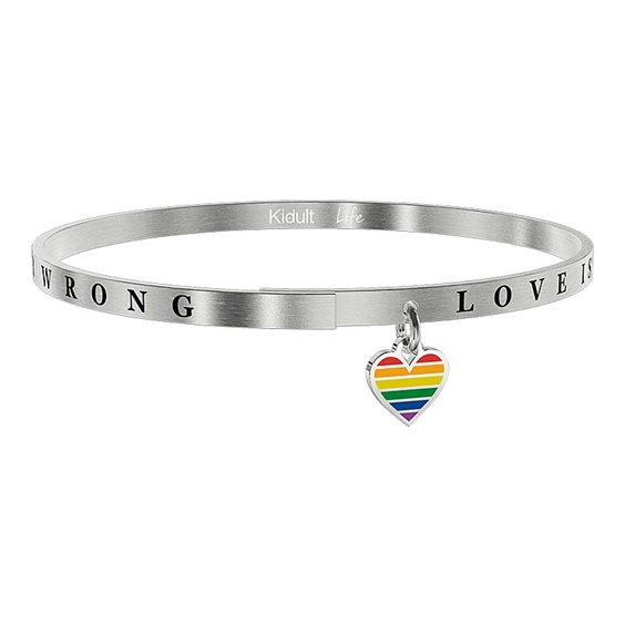 Bracciale Kidult rigido in acciaio ipoallergenico con incisione e ciondolo cuore arcobaleno. " Ama liberamente, senza confini, senza pensare, con tutto il tuo cuore. L'unica legge è quella che batte dentro di te. L'amore ha sempre ragione."