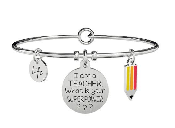 Bracciale bangle in acciaio 316L, circonferenza 20 cm, Ø 6 cm con ciondolo satinato e ciondolo matita smaltato. Scritta: I am a…SUPERPOWER? Dimensioni: ciondolo rotondo Ø 18 mm, ciondolo matita 5.5x15 mm, cristallo Ø 2 mm