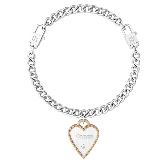 Bracciale Kidult in acciaio 316L con catena groumette "comfort fit" e ciondolo satinato a cuore con rifinitura borchiata color oro rosa e cristallo.Il sistema "comfort fit" permette facilmente di adattare in modo confortevole ed elegante il bracciale al tuo polso. Scegli la lunghezza della catena più adatta al tuo polso, agganciala ai due moschettoni e indossa il bracciale.Scritta in rilievo e cristallo sul ciondoloDimensione del cuore: 15,5 x 20 mmMisura Small, lunghezza 16 cm; misura Medium, lunghezza 17,5 cm; misura Large, lunghezza 19 cm