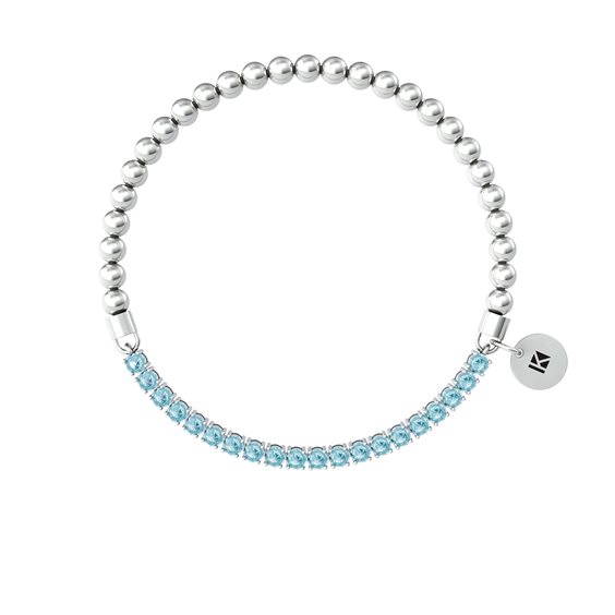 Bracciale elastico in acciaio 316L, circonferenza 17.5 cm con sfere lucide e tennis di glass azzurri. Dimensioni: sfere Ø 4 mm, glass Ø 3 mm