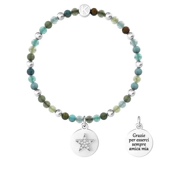 Bracciale elastico in acciaio 316L, circonferenza 17.5 cm, con agata striata multicolor e ciondolo, cristalli bianchi. Scritta: Grazie per esserci... mia. Dimensioni: ciondolo Ø 15 mm, pietre Ø 4 mm, cristalli Ø 1.25 mm