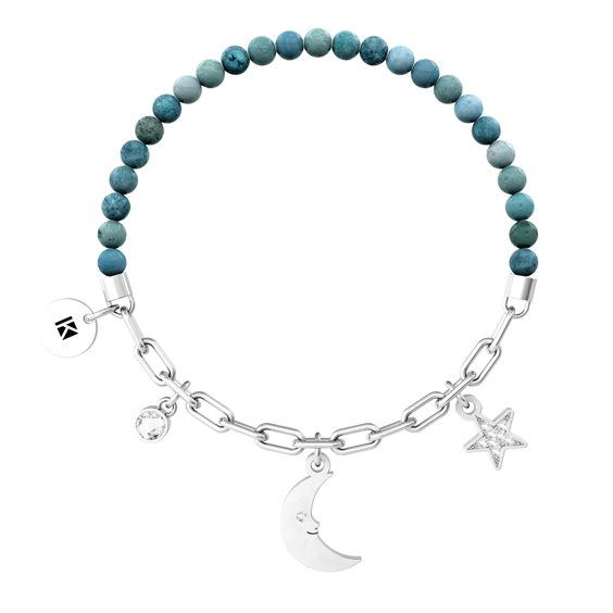 Bracciale in acciaio 316L, circonferenza 17.5 cm, con catena allungata e agata striata azzurra, ciondoli taglio luna e stella, cristalli bianchi. Dimensioni: pietre Ø 4 mm, luna Ø 11.5x17 mm, stella Ø 9x11.5 mm, catena 4 mm, cristalli Ø 4, 1.5 e 1.25 mm