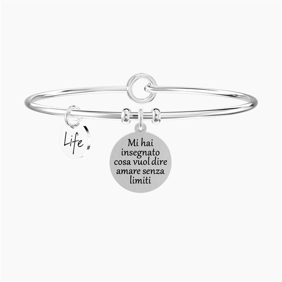Bracciale bangle in acciaio 316L lucido e satinato, circonferenza 20 cm, Ø 6 cm, ciondolo. Scritta: Mi hai insegnato... MAMMA. Dimensioni: ciondolo Ø 15 mm