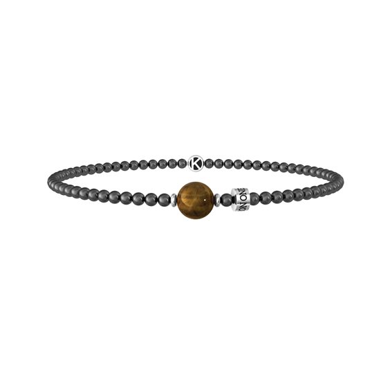 Bracciale elastico in acciaio 316L, circonferenza 18.5 cm, con sfere in PVD gunmetal e occhio di tigre. Scritta: ONE IN A MILLION. Dimensioni: sfere Ø 3 mm, pietre Ø 8 mm