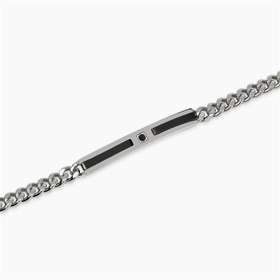 Bracciale in acciaio 316L lucido e satinato, lunghezza regolabile da 19.5 a 21 cm, con catena groumette satinata e spazzolata, piastra lucida e in PVD nero, cristallo nero. Dimensioni: larghezza catena 5.2 mm, piastra 40x5.4 mm, pietra Ø 2 mm