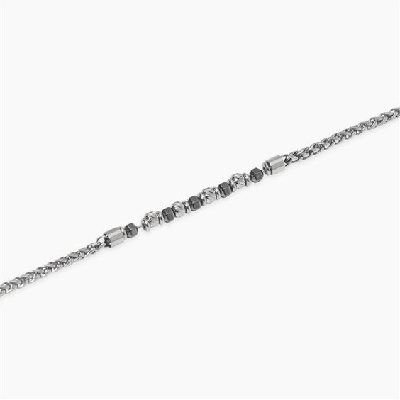 Bracciale in acciaio 316L, lunghezza regolabile da 19 a 21 cm, con catena spiga, cilindri lucidi a strisce e faccettati in ematite. Dimensioni: larghezza catena 3 mm, cilindri Ø 4.2 mm, pietre 4x4 mm
