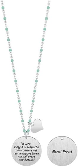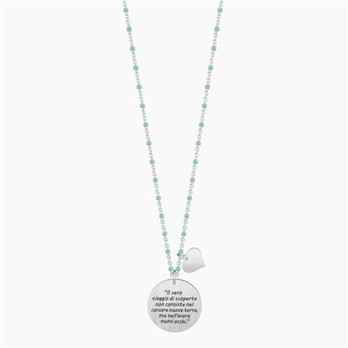 "Il vero viaggio di scoperta non consiste nel cercare nuove terre, ma nell'avere nuovi occhi." - Marcel Proust - Collana lunga in acciaio con ciondolo tondo e catena rolò con inserimenti in smalto verde acqua. • Incisione smaltata sul ciondolo e inserimenti in smalto sulla catena • Misura unica, lunghezza 80 cm • Materiale: Acciaio 316L, Smalto • Designed by Kidult in Italy