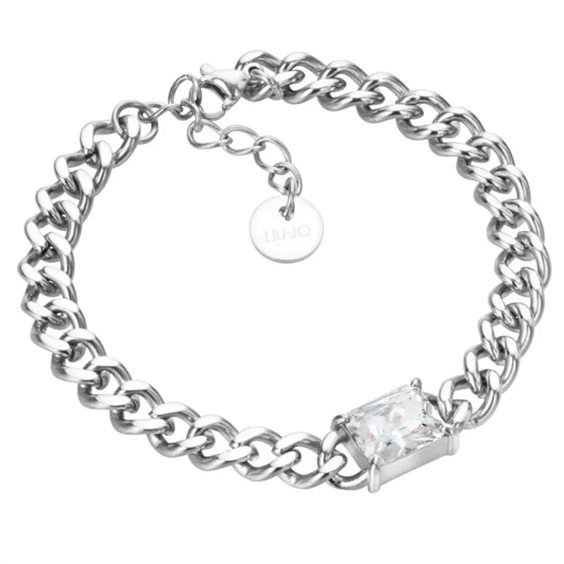 Bracciale da donna di Liu Jo della collezione Essential realizzato in acciaio color silver modello a catena lunghezza regolabile da 17 cm a 19 cm, con zircone di colore bianco, Chiusura con moschettone. Materiale Acciaio