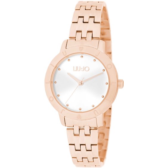 Orologio con cassa rotonda e ghiera acciaio rosa con logo, sfondo bianco, vetro minerale rotondo. 3 sfere con indici rosa a pallino, corona a pressione come il fondello. Cinturino in acciaio rose gold.