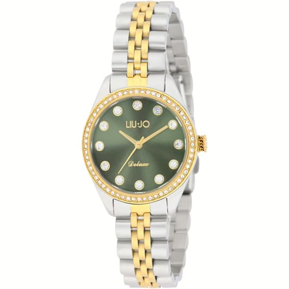 Orologio donna liu jo, tlj2426, collezione casual deluxe, movimento al quarzo, solo tempo, cassa in acciaio inossidabile bicolore 30 mm. quadrante verde con zirconi. cinturino in acciaio inossidabile bicolore. resistenza all'acqua di 5 atm