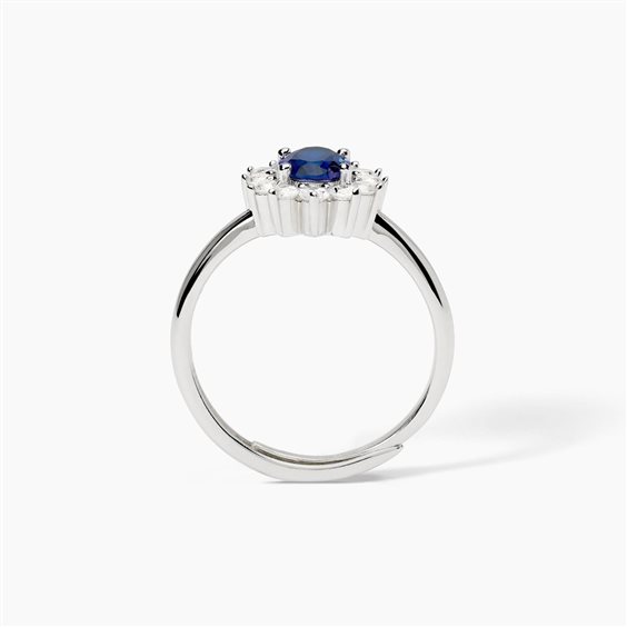 Anello in argento 925 rodiato, zaffiro sintetico e zirconi. Misura regolabile da 11 a 19.