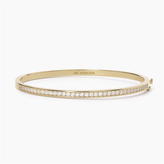 Bangle rigida in argento dorato con chiusura di sicurezza. Un gioiello dal design minimal imprezziosito da dettagli luminosi. • Dimensione degli zirconi: 2 mm • Misura large, misura interna 60X52 mm • Materiale: Argento 925 dorato, Zirconi