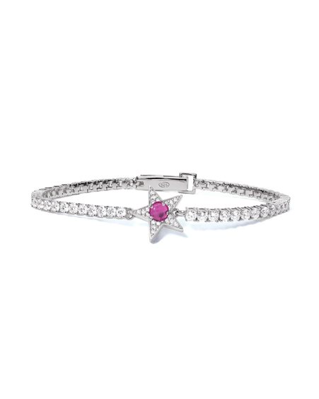 Bracciale Tennis Mabina in argento 925 con stella. Al centro della stellina un corindone sintetico rosa/fucsia contornato da zirconi bianchi. Gli zirconi bianchi del bracciale hanno un diametro di 2,5 mm. Questo gioiello fa parte della collezione sponsorizzata dai concorrenti di X Factor 2022 (X Factor Mabina Gioielli). La pietra rosa misura 4 mm, mentre gli zirconi all’interno della stella hanno un diametro di 1 mm. Questo bracciale è disponibile nella misura S (16 cm) e M (18 cm): scegli la tua! La chiusura del tennis è a molletta ed è infatti comodo e semplice da indossare.