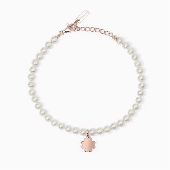 Bracciale in argento 925/°°° rosato con shell pearl Ø 4 mm e ciondolo quadrifoglio, lunghezza regolabile da 16 a 19 cm