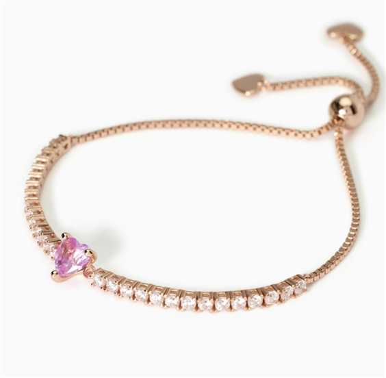 Bracciale in argento 925/°°° placcato oro rosa 18K con catena veneta 1 mm, tennis di zirconi bianchi Ø 2.5 mm e tormalina rosa sintetica centrale taglio cuore 6x6 mm, lunghezza regolabile da 16 a 22 cm