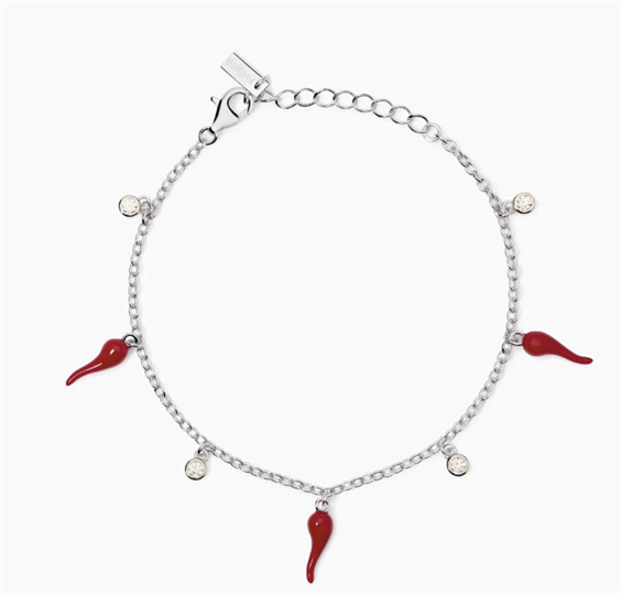 Bracciale in argento 925/°°° rodiato con catena forzatina 2 mm, ciondoli cornetto smaltati 4.5x13.5 mm e zirconi Ø 2.5 mm, lunghezza regolabile da 16 a 19 cm