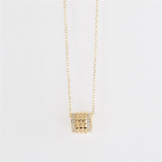 Girocollo da donna realizzato con catena rolò in argento 925% con finitura dorata. Anello pendente impreziosito da zirconi bianchi. Lunghezza di 45 cm. Chiusura con moschettone.