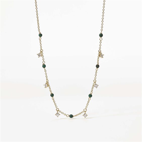 Collana donna , argento 925 dorato , girocollo maglia rolò , lunghezza cm 40 regolabile fino a cm 36 , zirconi bianchi incastonati con griffe , malachite mm 3/3,5 , chiusura con moschettone. Scatola e garanzia originali.