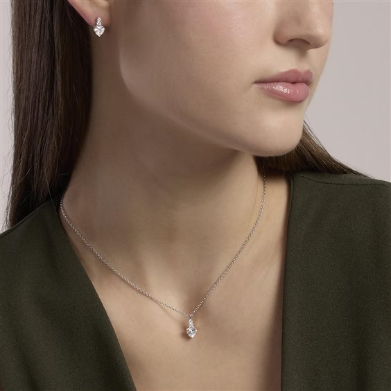 Girocollo in argento 925 rodiato e zirconi bianchi. Catena maglia rolò. Pendente cm 1,3 con 3 zirconi scalari, ultimo taglio cuore. Misura regolabile da cm 39 a cm 43.