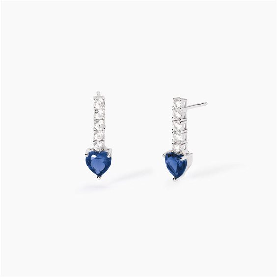 Orecchini tennis pendenti da donna in argento rodiato con zirconi e zaffiro sintetico taglio cuore. • Dimensione zaffiro sintetico taglio cuore: 6 x6 mm • Diametro degli zirconi : 2 • Lunghezza tot. orecchino: 2 cm • Materiale: Argento 925, Zaffiro sintetico, Zirconi