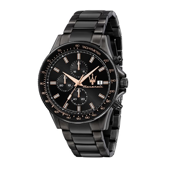 Orologio Maserati Cronografo Sfida total black and gold. Materiale e finitura cassa in Acciaio, misura cassa 44mm, spessore cassa 11,40. Cinturino in metallo, water resistant 10atm