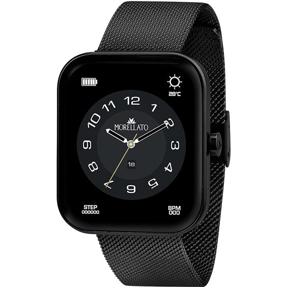 Smartwatch da uomo MORELLATO della collezione M-02 con batteria ricaricabile. Cassa rettangolare in alluminio dalle dimensioni di 45.5 mm x 38.5 mm e spessore 11.30 mm. Dispaly touchscreen a colori, quadranti personalizzabili. Cinturino modello maglia milano in acciaio inossidabile 316L color nero con chiusura a scatto. Vetro minerale. App dedicata e compatibilità con con iOS 10 o successive e Android 5.0 o successive. Connettività Bluetooth. GPS integrato. Visualizzazione delle notifiche dello smartphone. Avviso di chiamata. Funzioni di contapassi e cardiofrequenzimetro. Calorie bruciate e monitoraggio del sonno. Impostazioni multisport per i tuoi allenamenti. Cronometro. Meteo. Controllo remoto della musica.